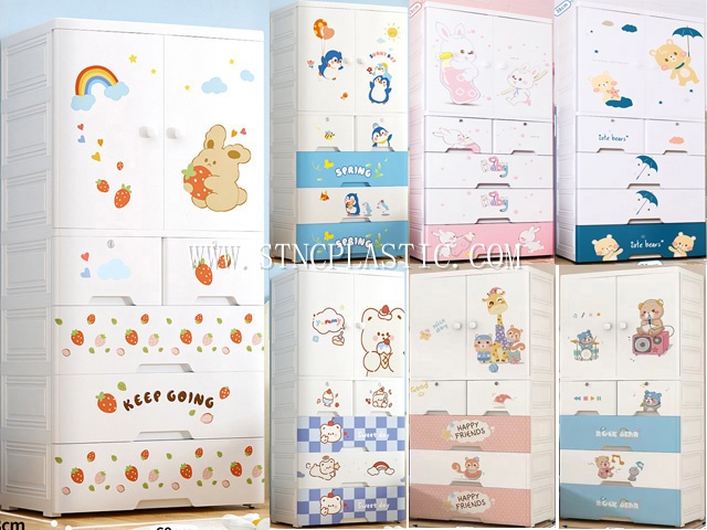 NO.:NC034679 DESC.:70cm plane width plastic sides opening door storage cabinet with 3 big drawers and 2 small drawers rabbit/cute bear/rock bear/deer/strawerberry rabbit/litter penguin/cake bear SIZE:70*38*156CM PACKING:72*44.5*64CM/1PCS QTY:0PCS/20FT. 0PCS/40GP. 0PCS/40HQ