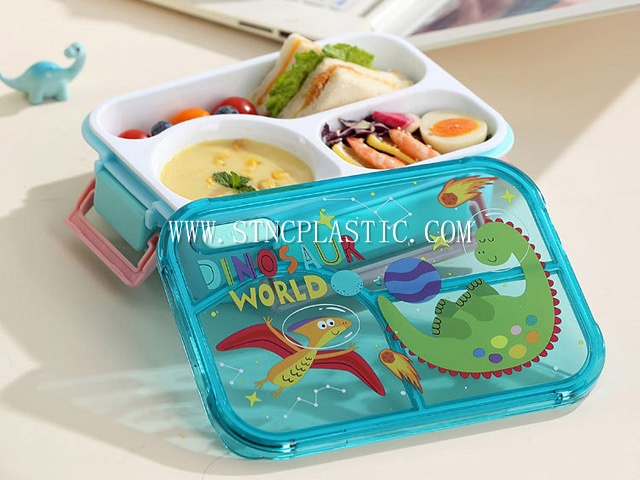 DESC.:plastic rectangular cartoon 3-grid lunch box with bowl/spoon&fork 650ml